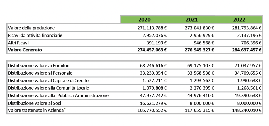 Il valore economico generato complessivamente da Publiacqua nel 2022 ammonta a 284,6 milioni di euro. La distribuzione di tale valore tra gli stakeholder è articolata come segue: il 25% ai fornitori; il 12,2% ai dipendenti; il 2,8% agli azionisti sotto forma di utili; lo 0,7% ai finanziatori come interessi sul capitale fornito; il 6,8% alla pubblica amministrazione come imposte e contributi versati e lo 0,4% alla comunità attraverso erogazioni liberali e sponsorizzazioni di eventi e manifestazioni. Il restante ammontare, circa 148,2 milioni (52,1%) è stato trattenuto dal sistema impresa. Si tratta della fiscalità anticipata e differita, degli ammortamenti e degli accantonamenti a fondi rischi e oneri.