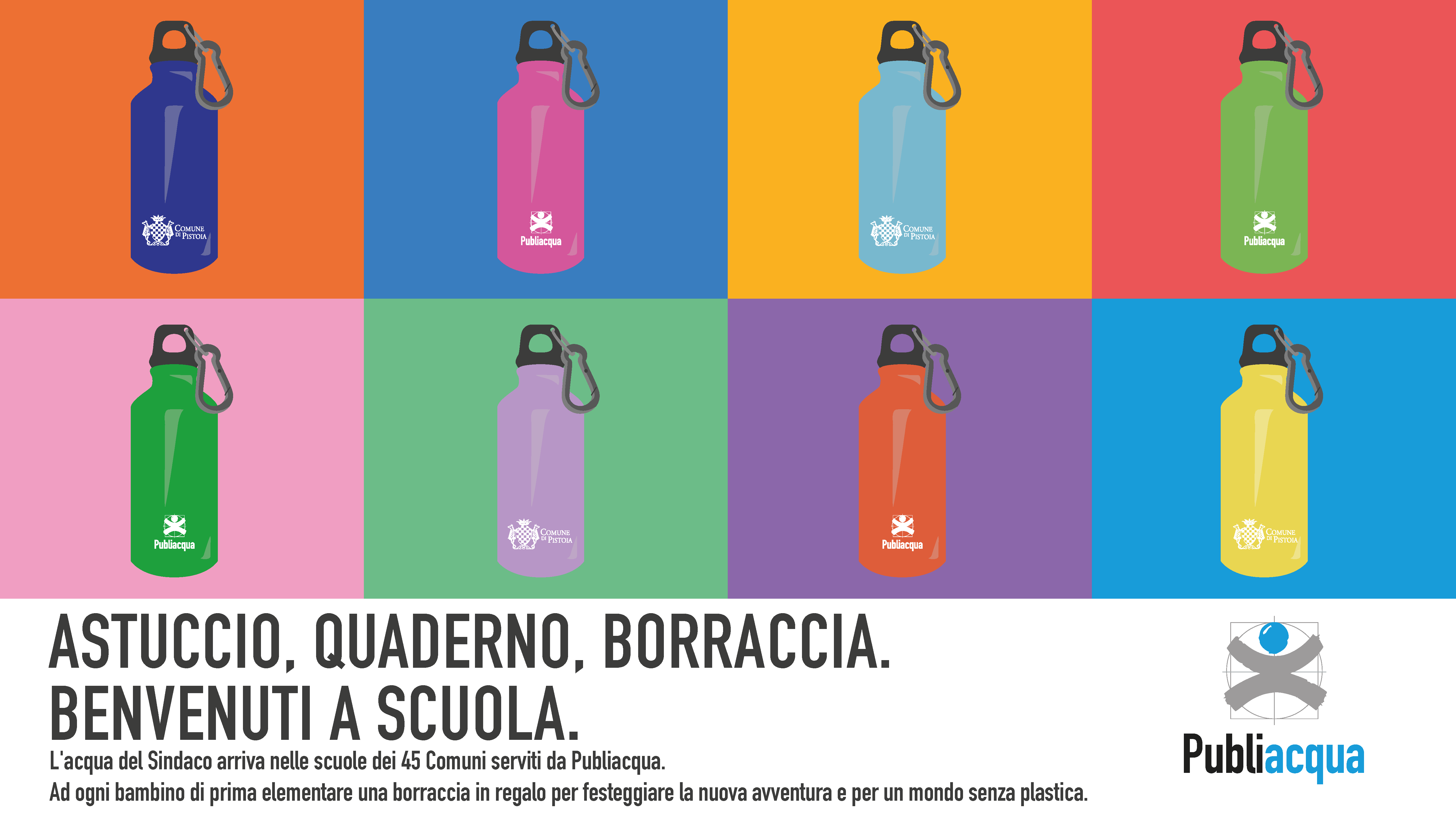 Per l’anno scolastico in corso Publiacqua distribuirà a Pistoia 683 nuove borracce dotate del tappo tradizionale ma anche di un tappo antigoccia. Queste vanno ad aggiungersi alle borracce donate l’anno passato (750 a Pistoia e complessivamente oltre 13.000 ai nuovi studenti di prima elementare del territorio dei 45 Comuni dove Publiacqua gestisce il servizio idrico integrato) ed a quelle che gli altri Comuni del territorio stanno anch’essi distribuendo per l’anno scolastico in corso come prezioso supporto agli studenti, alle famiglie ed alle scuole stesse in un 2020 complicatissimo.